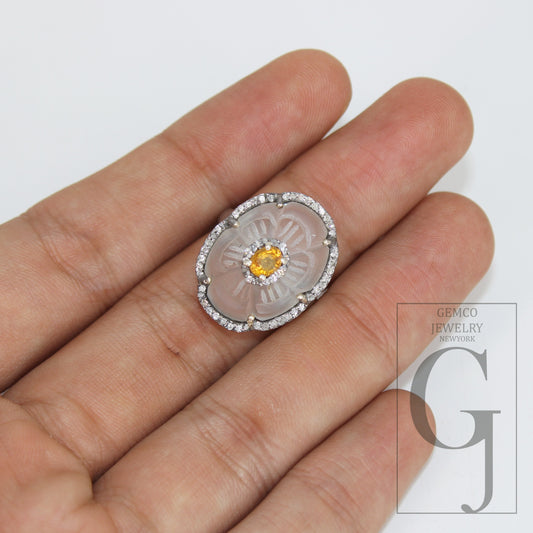 Beautiful Crystal Ring Yellow Sapphire Ring Designer Rosecut Pave Diamond Rings 925 Sterling Silver Handmade Silver Finish Diamond Rings