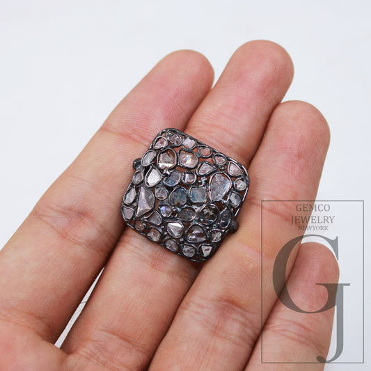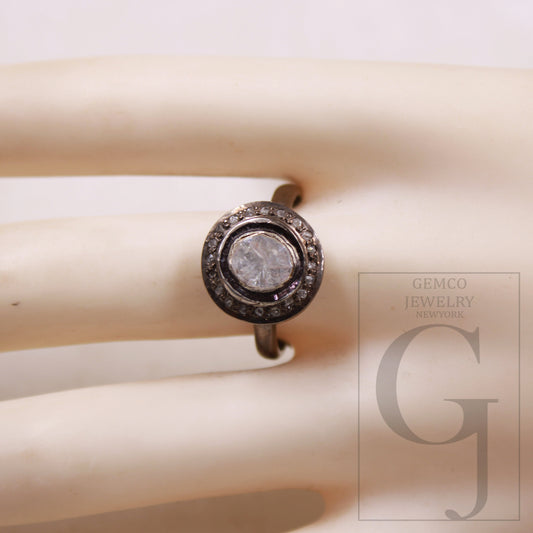 Antique Oxidized Finish Designer Flat Diamond Ring Rosecut Polki Diamond Ring Sterling Silver Handmade Silver Finish Diamond Ring Jewelry