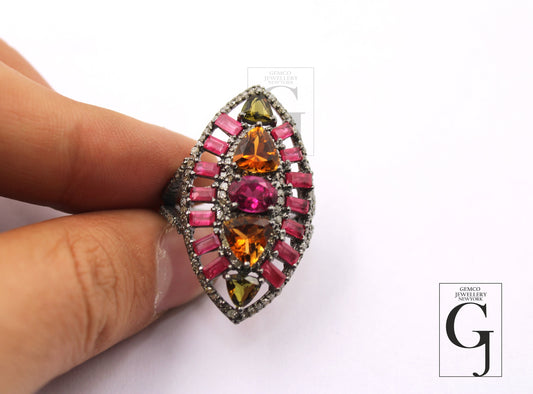 Beautiful Multi Tourmaline Marquise Designer Rosecut Pave Diamond Rings 925 Sterling Silver Handmade Silver Finish Diamond Cocktail Ring
