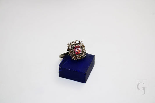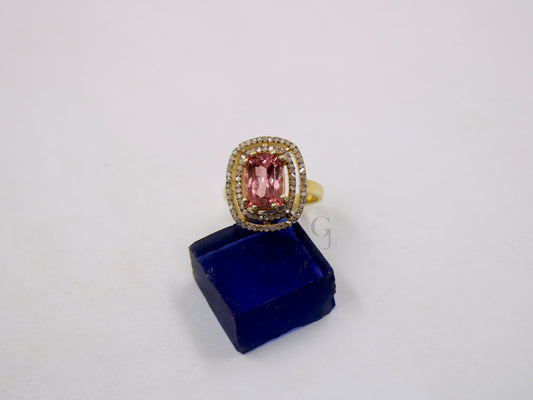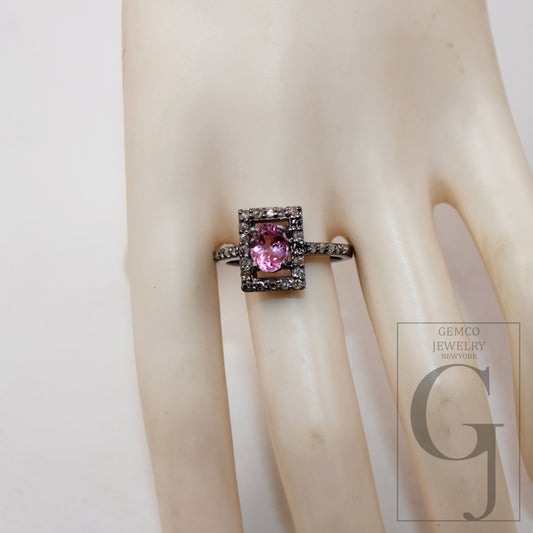 14k Gold Finish Beautiful Pink Tourmaline Ring Designer Rosecut Pave Diamond Rings 925 Sterling Silver Handmade Silver Finish Diamond Ring