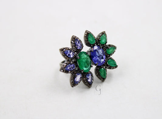 Very Beautiful Emerald And Tanzanite Ring Designer Rosecut Pave Diamond Rings 925 Sterling Silver Handmade Silver Finish Diamond Ring