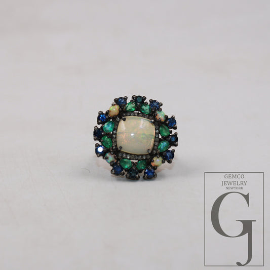Designer natural fire opal emerald blue sapphire ring Rosecut pave diamond ring 925 sterling handmade silver finish diamond ring jewelry