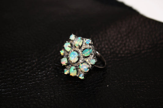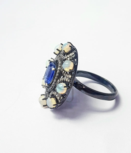 Rocecut pave diamond rings 925 sterling silver handmade silver finish diamond opal and kyanite stone very beautiful rings