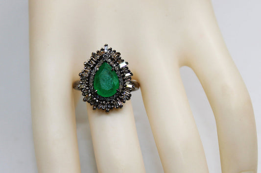 Antique Look Designer Pear Emerald Baguette Diamond Ring Rosecut Pave Diamond Rings 925 Sterling Silver Handmade Silver Finish Diamond Ring