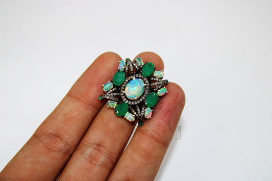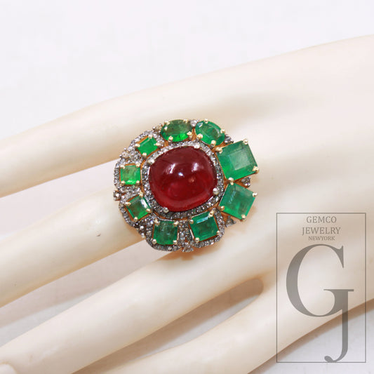 14k Gold Finish Green Emerald Ruby Ring Designer Rosecut Pave Diamond Rings 925 Sterling Silver Handmade Silver Finish Diamond Ring Jewelry
