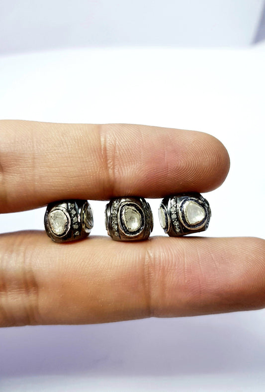 1pc Polki Design Rosecut Pave Diamond Bead 925 Sterling Silver Handmade Silver Finish Flat Diamond Bead