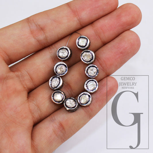 1pc Coin Shaped Polki Bead Rosecut Pave Diamond Bead 925 Sterling Silver Handmade Silver Finish Flat Diamond Bead 9mm/6mm Slice Diamond Bead
