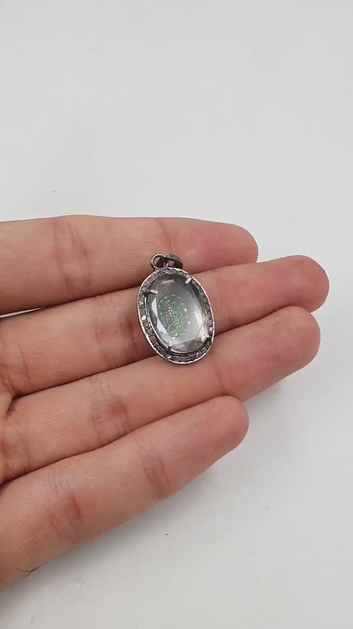 Beautiful Designer Rosecut Pave Diamond Pendant 925 Sterling Silver Handmade Finish Natural Oval Crystal Stone Center Stone  Diamond Jewelry