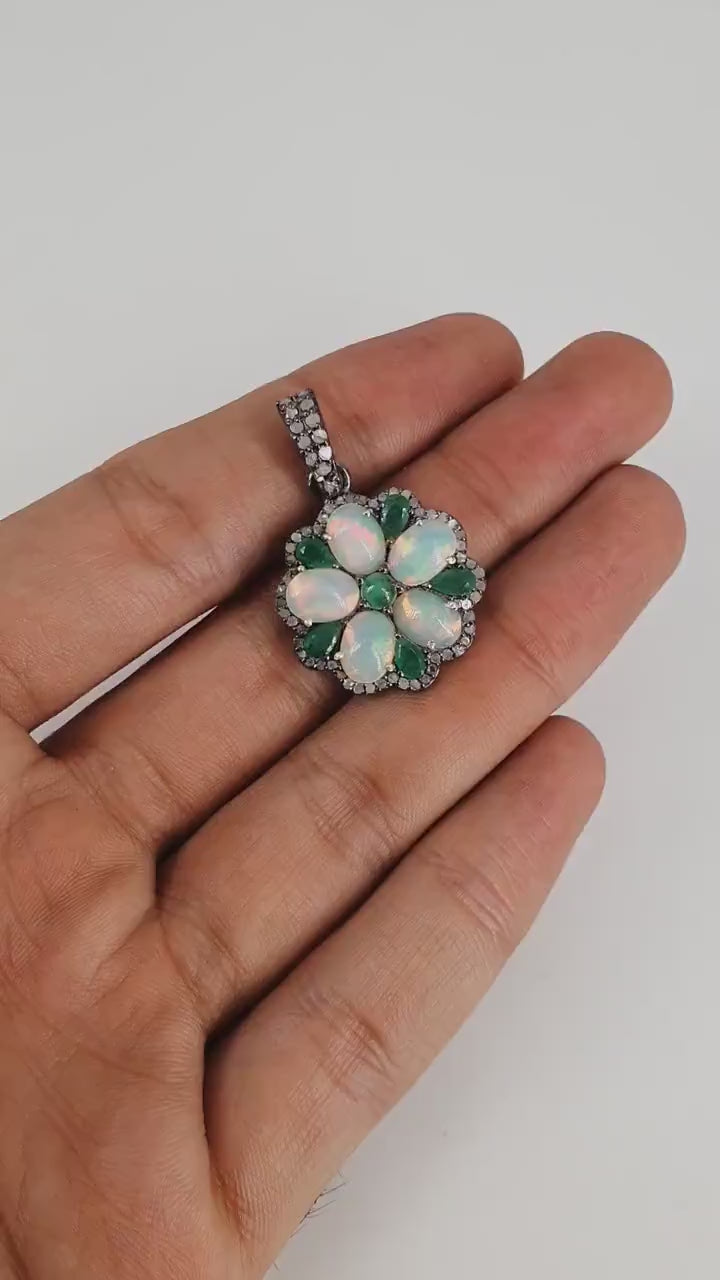 Emerald Opal Designer Flower Pendant Rosecut Pave Diamond Pendant 925 Sterling Silver Handmade Finish Diamond Charms Necklace Pendant